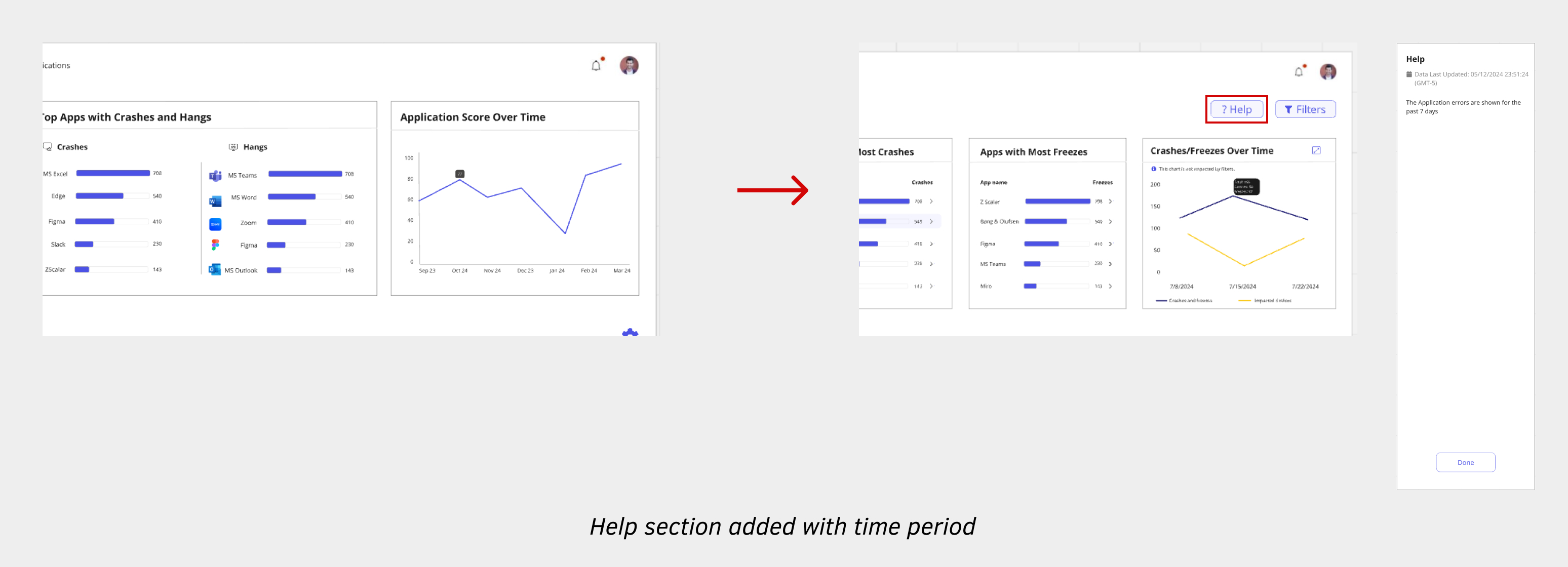 - Unable to display past 3 months of app data - the devs were unable to store past 3 months of app errors due to infrastructure issues. We resorted to displaying 7 days of real-time app data and communicating it with the user by adding help section at the top of the page.