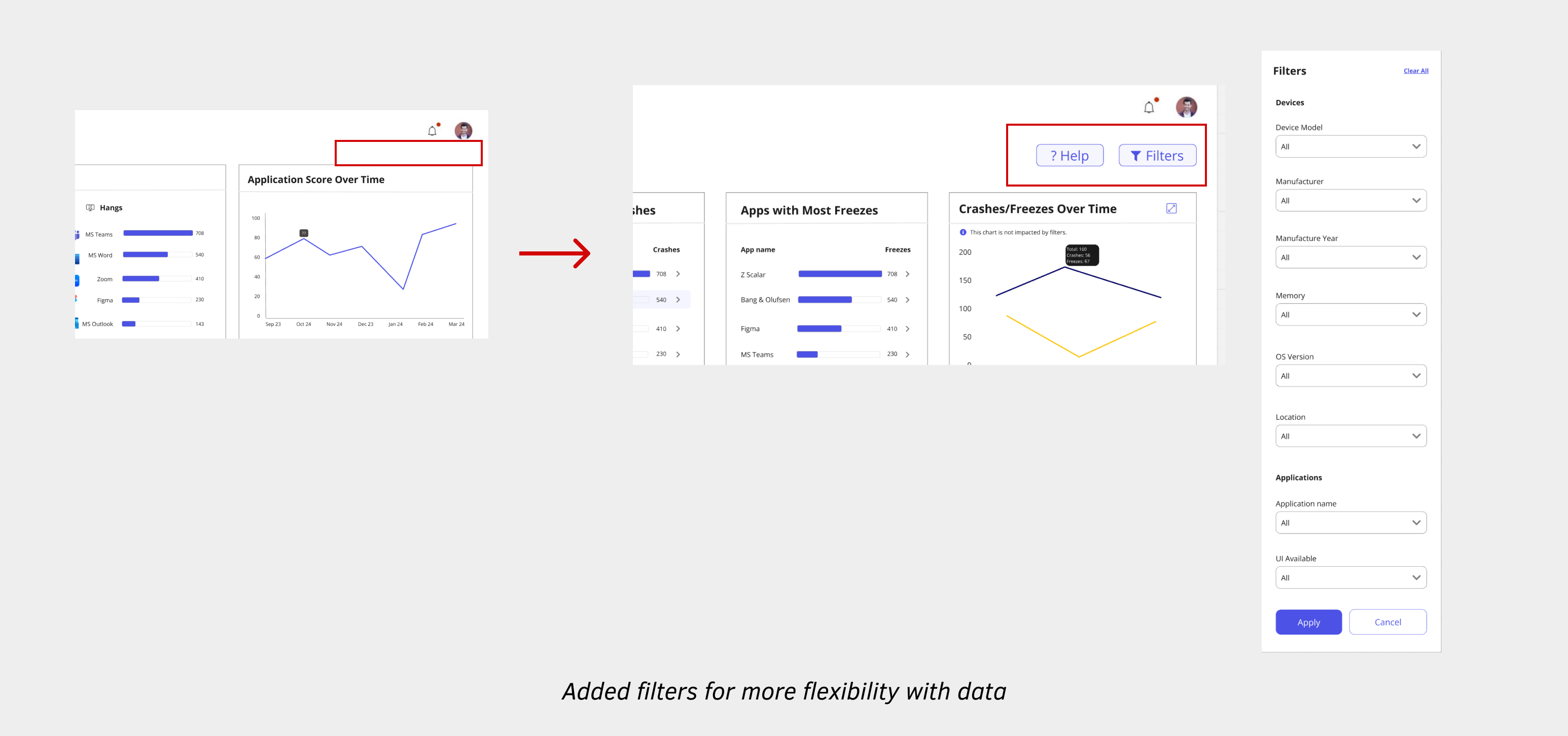 - They required page-specific filters to update data and charts, allowing them to analyze the data based on various categories like device model, manufacturer, OS version, and more.