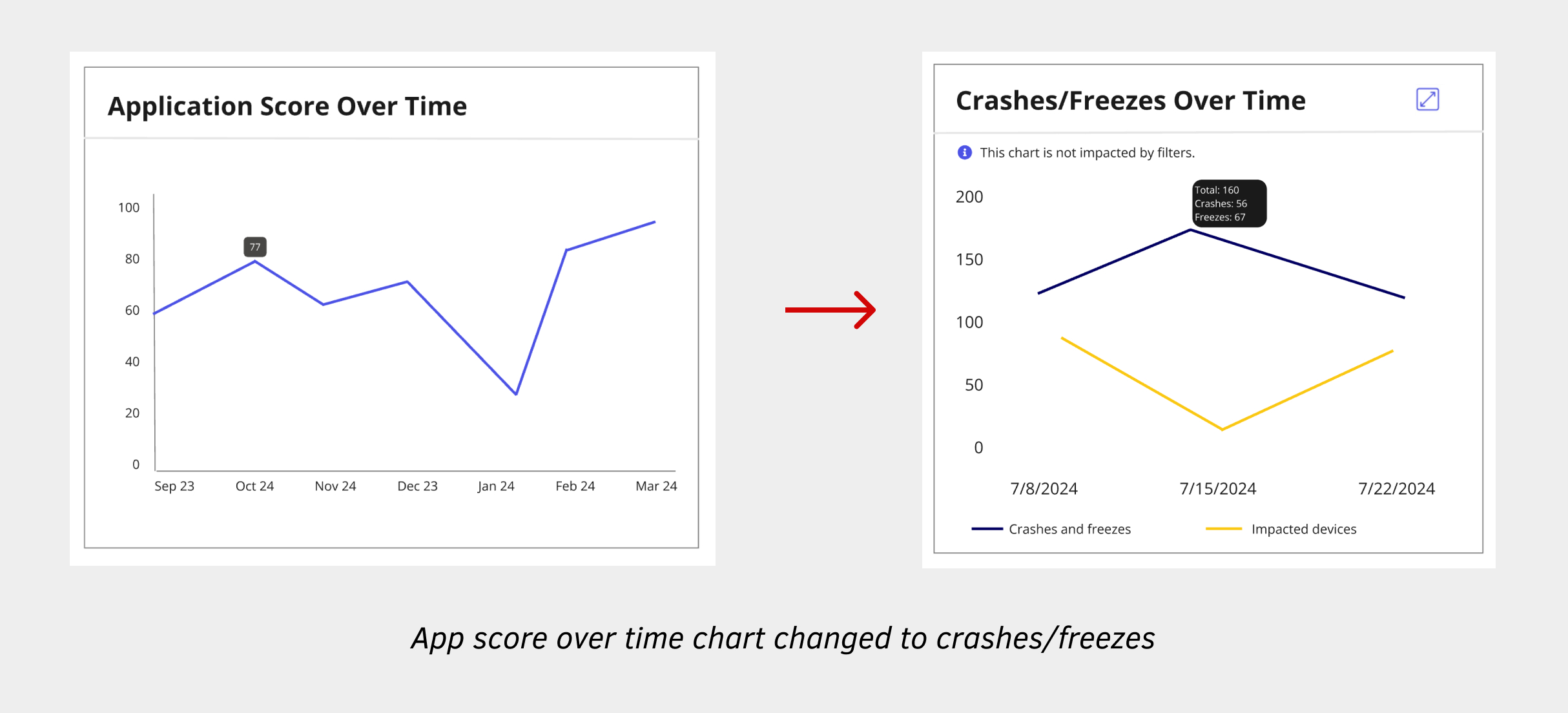 - The PM mentioned that application crashes/freezes over time along with the impacted devices would give them more specific data on the app health rather than application score over time