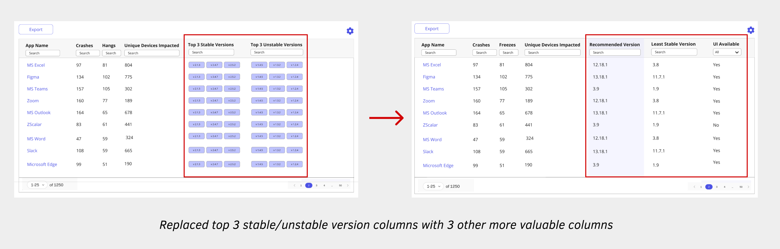 - Include table columns such as Recommended Version, Least Stable Version and UI Availability, Last Crash Occurrence, Last Freeze Occurrence.